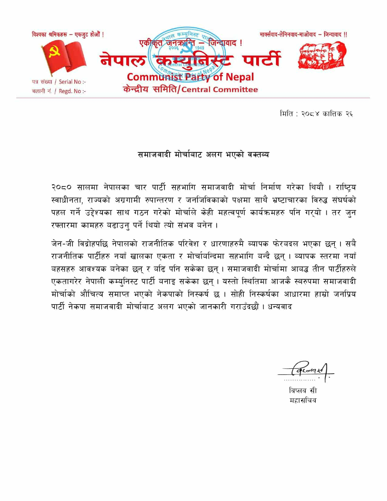 समाजवादी मोर्चामा आबद्ध तीन पार्टीहरूले एकता गरेर नेपाली कम्युनिस्ट पार्टी बनाइसकेका छन् । यस्तो स्थितिमा आजकै स्वरुपमा समाजवादी मोर्चाको औचित्य समाप्त भएको नेकपाको निष्कर्ष छ । सोही निष्कर्षका आधारमा हाम्रो जनप्रिय पार्टी नेकपा समाजवादी मोर्चाबाट अलग भएको जानकारी गराउँदछौं ।’